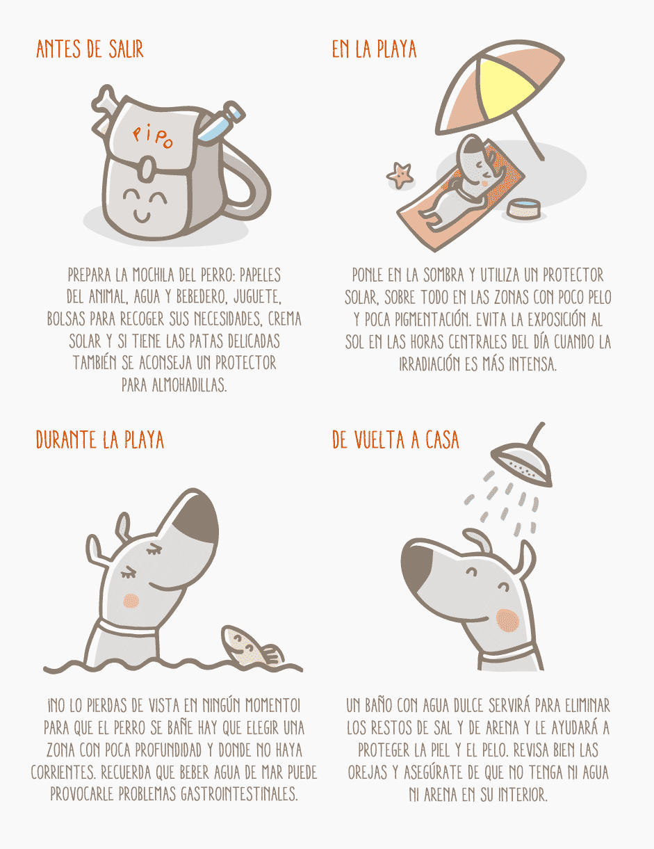 Asegúrate de que beba agua regularmente: se la puedes ofrecer tú o le puedes dejar su bebedero cerca. Para que se mantenga fresca guarda el agua en un lugar protegido del sol. Beber le ayudará a mantenerse hidratado pero beber agua de mar no le sirve para hidratarse: en cambio puede provocarle problemas gastrointestinales. Así que vigila y no dejes que la beba.