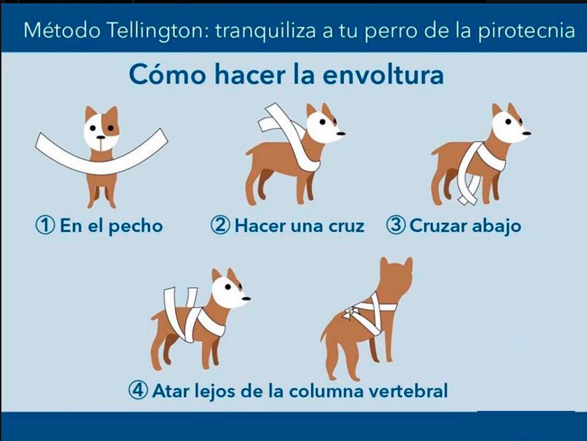 Podemos intentar ayudarles mediante el sencillo método Tellington Ttouch que te mostramos a continuación. Es un fácil truco casero con el que, mediante un vendaje alrededor de su cuerpo de un modo estratégico, conseguimos que se sientan protegidos. Tendrán la sensación de una ligera presión sobre sus músculos, como si su dueño le estuviera acariciando y protegiendo.